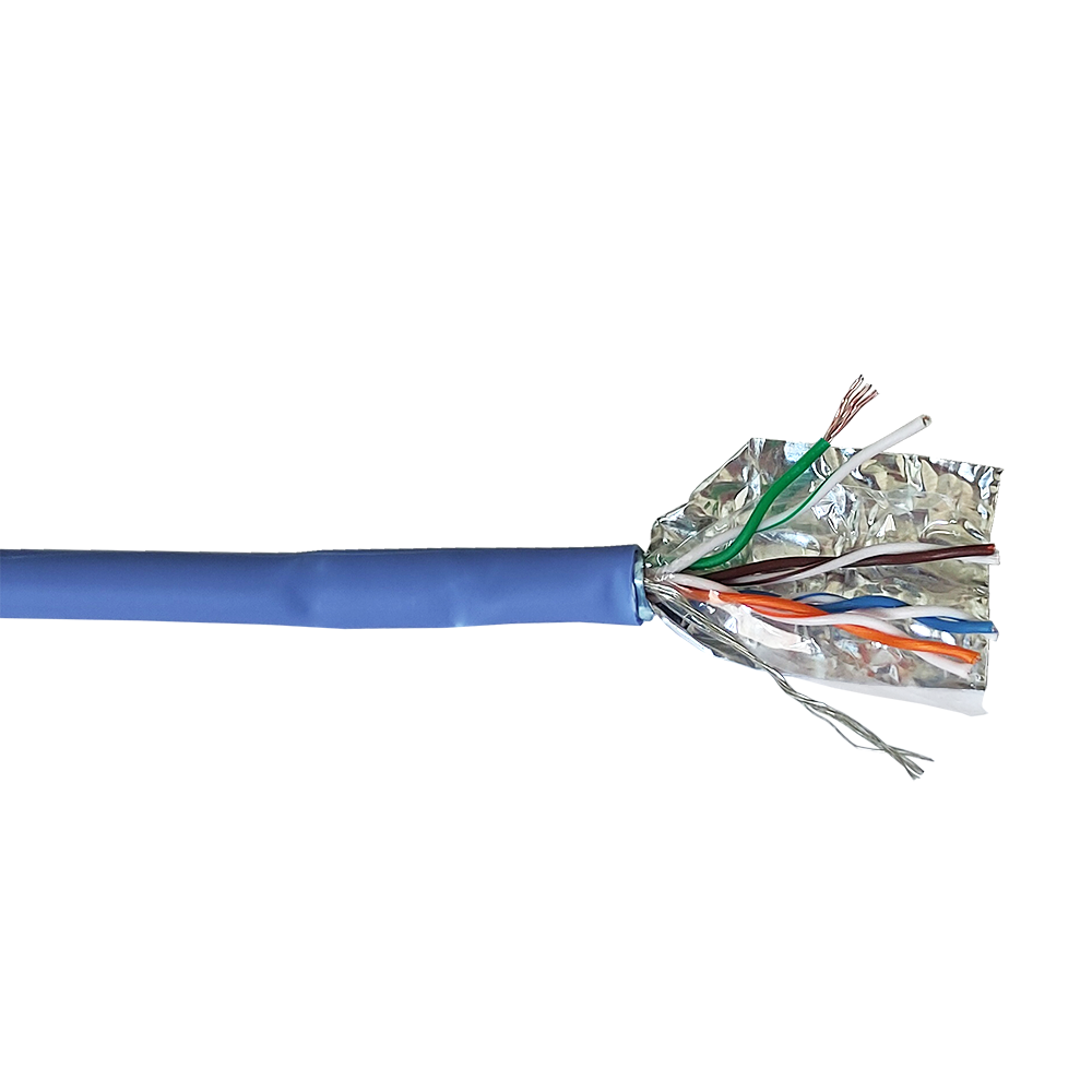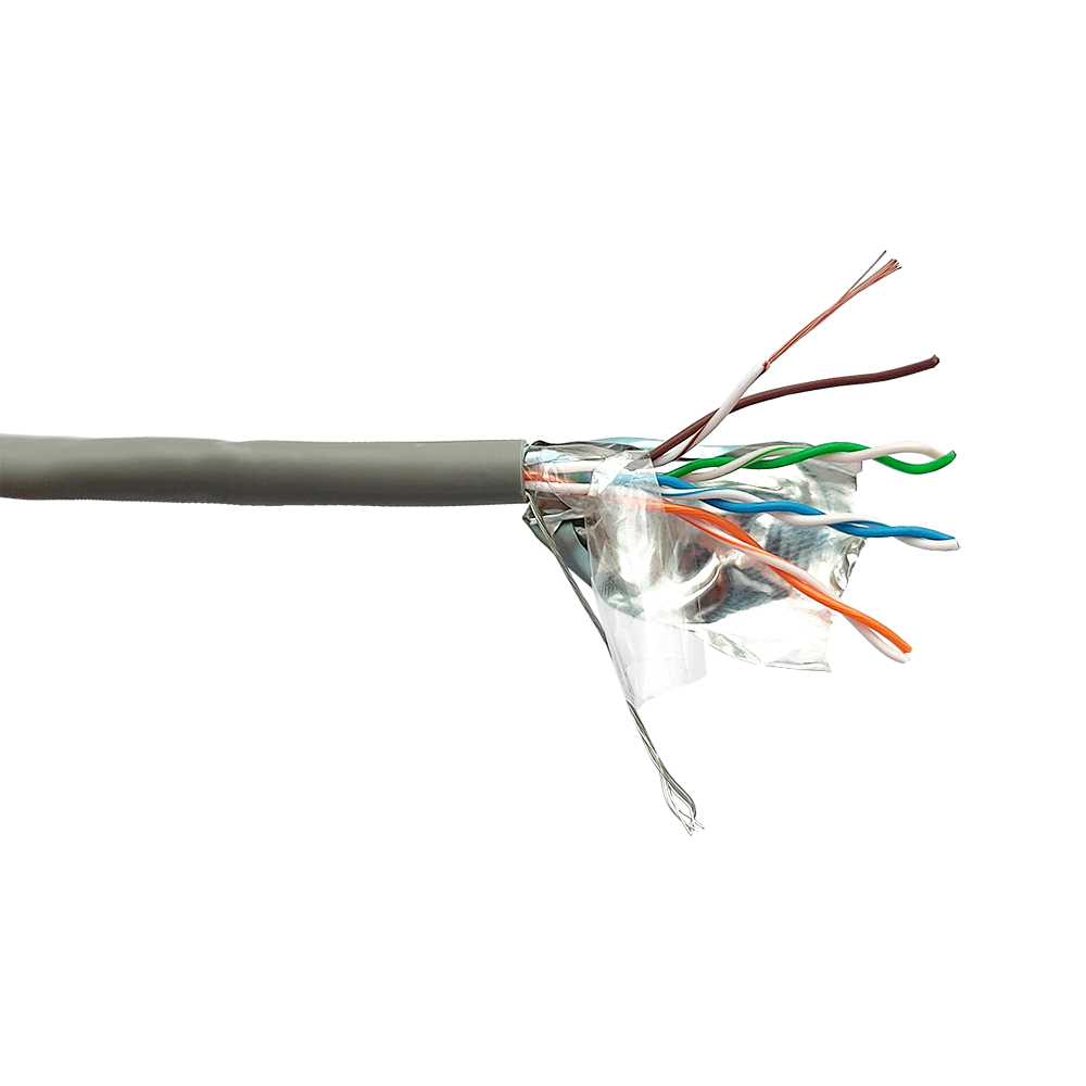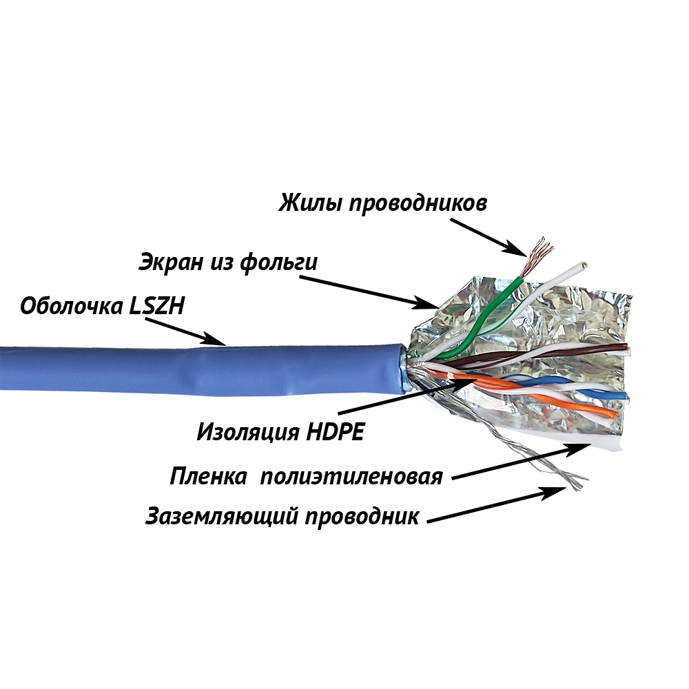 Два проводника, скрученных со специально подобранным шагом, составляют одну витую пару. Четыре витых пары заключены в общий экран из фольги и оболочку из LSZH (низкодымящая, не содержит галогенов).
