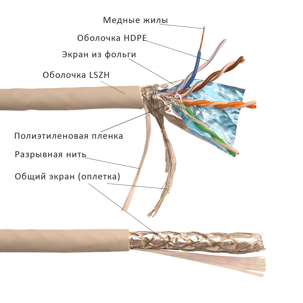 Четыре витых пары обернуты полиэтиленовой пленкой и заключены в общий экран из фольги, затем в проволочную оплетку. Верхним слоем является оболочка из HFLT (не поддерживающий горение, для групповой прокладки с отсутствием коррозийно-активных и токсичных веществ при тлении). На оболочке кабеля нанесены последовательные метровые метки длины.
