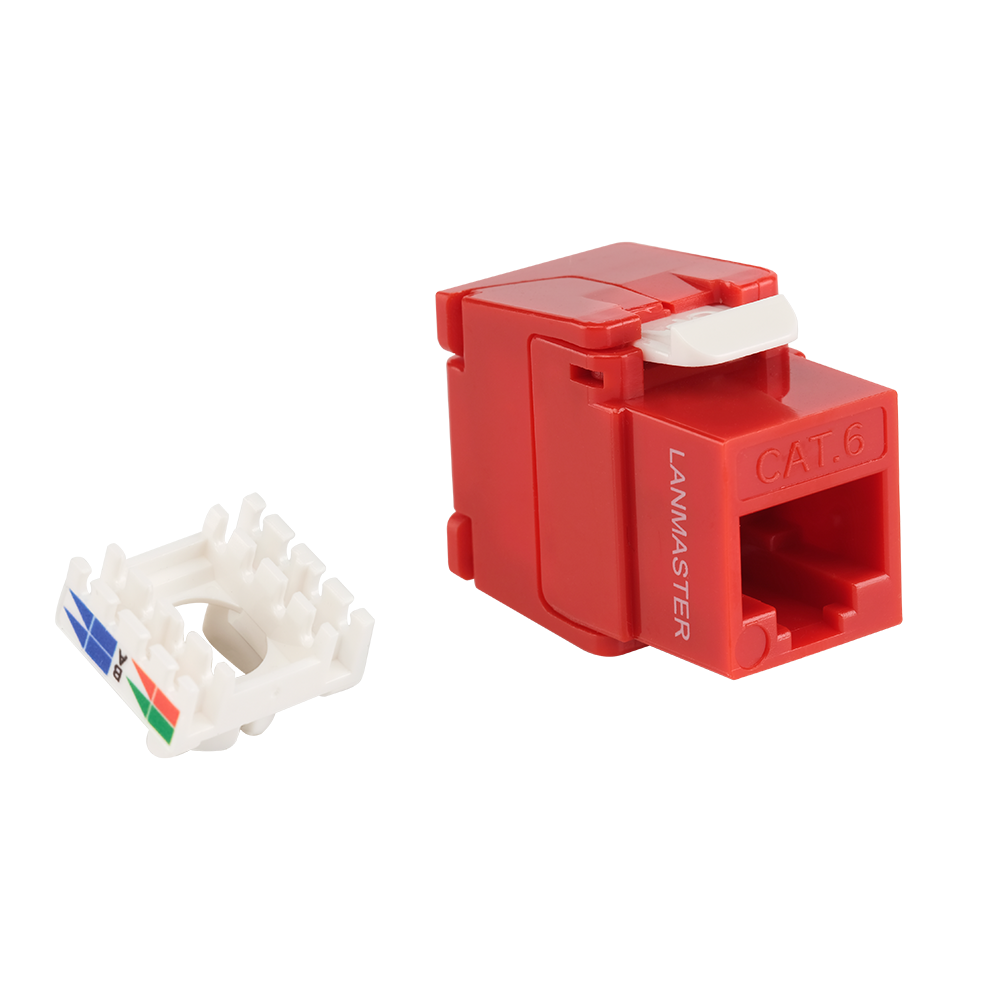 Модуль имеет стандартный типоразмер Keystone и может использоваться не только в розетках LANMASTER, но и в розетках других производителей. Цветовая маркировка панели целиком или отдельных ее элементов позволяет визуально идентифицировать порты. Поэтому разноцветные модули KeyStone могут использоваться как способ увеличения эффективности администрирования СКС. На лицевой стороне модуля смонтировано восьмиконтактное гнездо типа RJ-45, с обратной стороны установлен блок на восемь контактов типа IDC110, расположенных под углом 180˚ к лицевой поверхности модуля. Для подключения кабелей используется способ врезного контакта сквозь изоляцию - IDC. Для удобства монтажа, на крышке модуля расположена схема подключения проводников кабеля, в соответствии со схемами T568A и T568B. Кабель раскладывается в пазы на крышке модуля, излишки обрезаются. При защелкивании половинок крышки корпуса, контакты прорезают изоляцию проводника. Таким образом, подключаемый кабель легко монтируется без использования инструмента. |